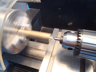 | 突っ切りバイトで薄く浚ったあとローレットをかけ・・ | 1Rの姿バイトでテーパー部を整え | ピカールをつけた耐水ペーパーで磨いた後・切断 |