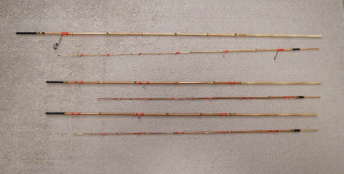 | 11月1日 あとあと・・ガイドの取付・巻き留めた糸の塗りなどが大変なので今回は3セットだけ・・ 上から・・ のべ竿9尺を印籠3本継ぎに改造したもの ルアー竿5.6フィート、フライ竿5フィートの2セットです フライとルアーの竿の印籠芯は径3.5ミリ~4ミリの細い矢竹・・ 5~6cmの長さに0.2から0.3ミリのテーパーがあるのを探し火をいれ中芯にカーボンソリッドを入れてます 継ぎの作業にはけっこう時間がかかりました・・ |