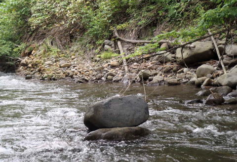 大きな石がゴロゴロの荒場の少し手前の流れ・・白泡の中に毛バリを落としてやると 良いヤマベがきました。 |