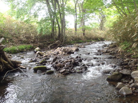 | 6月4日(火) 浜益川支流・逆川、毘砂別川 天気は今日から下り坂・・午後は雨の予報です・・で・・近場の川に行くことにしました。 望来あたりはガスがかかっていたが・・厚田をすぎると 曇り空ながら少し明るい・・ 逆川 6時前、いつもの駐車場所に車をとめ6フィート6インチ、#3の竿をもち川に入る。 今シーズン初めてのフライ・F・・さて釣れるでしょうか‥ 水量少なく歩きやすい・・最初は小ニジ、次も小ニジ やっと浅いポイントから小ヤマベが釣れました・・ |