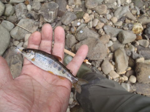 毘砂別川 一寝入りしているうちにポツポツと雨が降ってきたが・・たいした雨でもなく まだ帰るには早いので6フィートの短い竿で11時すぎ川に入る 水が冷たく・・入ってすぐは全くヤマベの反応が無い。 しばらく進みやっと釣れたのは・・可愛い小・小ヤマベでした。 |