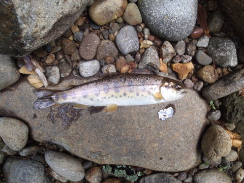 | 良いヤマベです・・同じ場所で2匹目。しかし・・ 寄せるときに逃げられ・・(キャツチせずにリリースですなァ・・)これも良型でした。 釣り開始5分で・・こんな良型ヤマベが釣れるとは・・驚きですが あとが続きません。 小ヤマベや小イワナが釣れるだけ・・です。 |