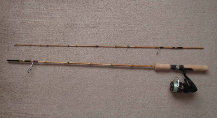 布袋竹5フィート6インチのルアー竿 今まで作ったルアー竿よりやや竹の径が太く少し硬めですが グリップの握るところに重心がありバランスの良い仕上がり ただ節をかわしてのガイドの取付には、いつものことながらけっこう苦労しました |