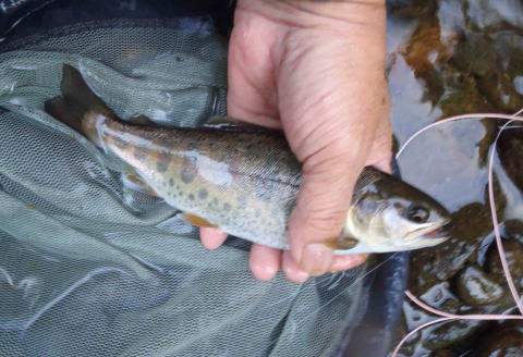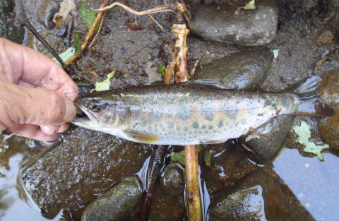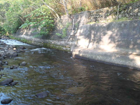 | 湯ノ沢川との合流点下の深みで虫をとっているのを見た・・キラリと水中に魚体が見え そっと近づいて毛ばりを流してやる 何度目かでフッキングしたが・・毛ばりをとられ・・逃げられる 少しねばってみたが・・さすがにもうきません 小ヤマベやアメマスを釣って進み・・ 壊れた鉄の橋のいつも良いヤマベやニジのいるポイントではなんの反応もなく・・ ここをかわしたところで2匹目の良型ヤマベがきました |