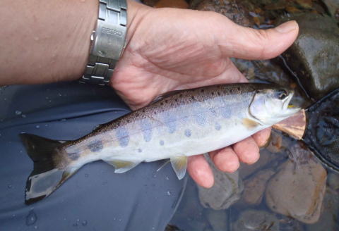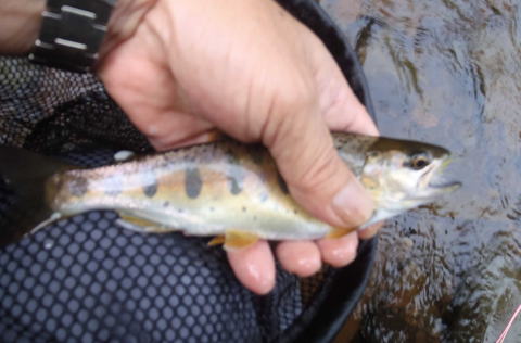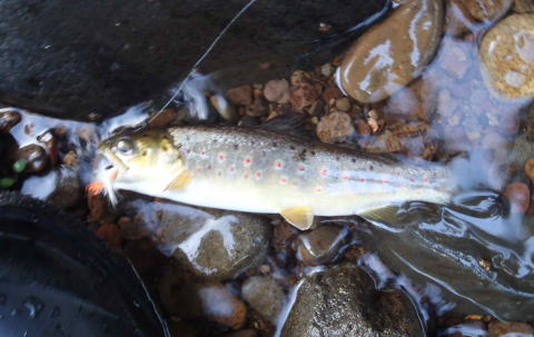 小ヤマベが釣れたあと(外来種の)ブラウン・トラウトが釣れた・・ この上ではこれより二回りくらい大きいブラウンがきた・・昆布川・・まだブラウンがいるんだ・・ まずまずのサイズのヤマベもきました |